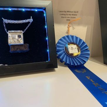 "Looking Out My Window" won a third place ribbon in the Backus "Best Of The Best" in 2022. This is a locket which opens to reveal a skyline with a moon.